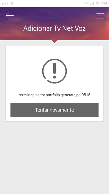 Não tenho o meu serviço adicionado no My Vodafone dado que, por algum motivo, nunca consegui pedir chave de ativação. Nos últimos meses sempre que tento, tanto a partir do website como a partir da aplicação, recebo mensagens de erros pouco verbosas.