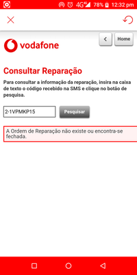 Recebi logo pelas 11h00 uma sms com uma referência da avaria reportada. No entanto, mesmo agora às 13h05, inserindo esse código na app myVodafone recebo a indicação "A ordem de reparação não existe ou encontra-se fechada." . Parece-me só ridículo. (fotos disponíveis abaixo)