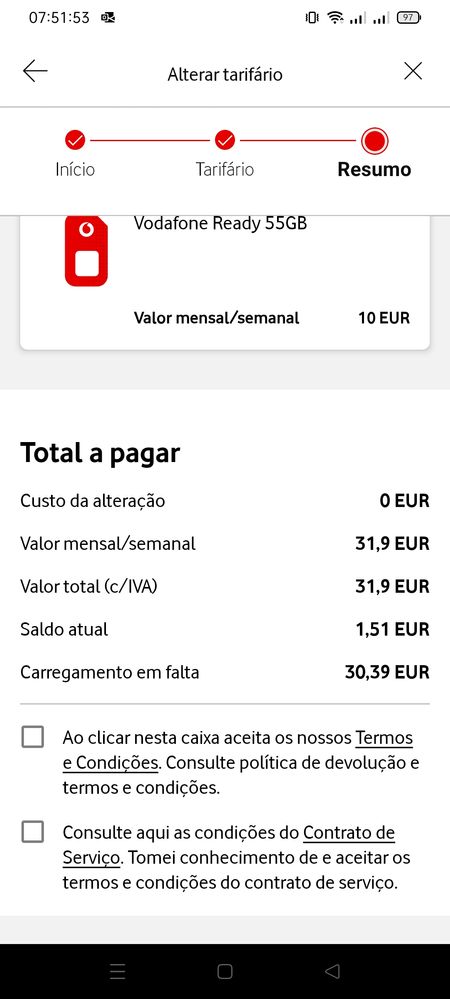 Estou a tentar alterar o tarifário, atual vodafone ready 20Gb, para o vodafone ready 55Gb, através da app my vodafone.