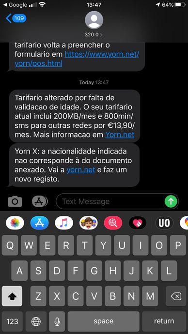 Não nos pediram documento nenhum comprovativo da idade dele no início mas passado uma semana da adesão disseram que ele não cumpria todos os requisitos para fazer parte da Yorn. Tentamos perceber o porquê e parece que não tínhamos entregue o cartão de cidadão. Muito bem, podiam ter pedido isso logo de início. Enviámos o cartão mas estava caducado desde Março e não teve a possibilidade de o renovar por causa da pandemia. Mesmo assim disseram-nos que iam tratar do assunto. Não trataram, voltamos a receber a mensagem que o tarifário não foi validado. Já com o novo cartão de cidadão enviamos o mesmo através do messenger da yorn que nos encaminharam para o 16911. Ligámos ia ficar tudo bem, até íamos receber um sms para completar o registo. Recebemos o SMS, preenchemos como pedido, resposta não conseguimos validar o teu CC.